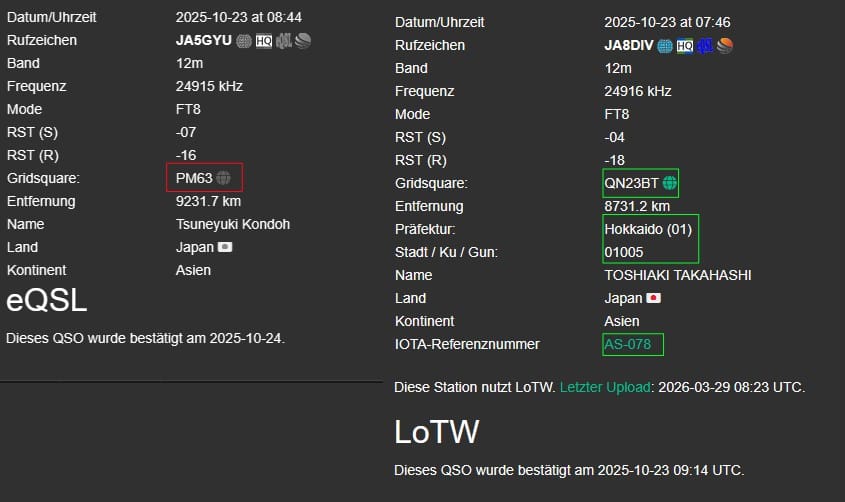 Schauen wir uns dazu den Vergleich zwischen 2 QSOs an. Beides in FT8, bedeutet effektiv ausgetauscht habe ich mit meinem QSO-Partner Callsign, 4 stelliger Locator und Rapporte. JA5GYU (links) hat bisher nicht per LotW bestätigt, JA8DIV (rechts) schon.