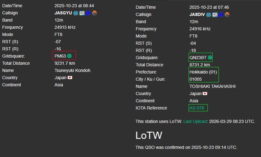 Let’s take a look at a comparison between two QSOs. Both are FT8, which effectively means I exchanged callsign, 4-digit locator, and signal reports with my QSO partners. JA5GYU (left) has not confirmed via LotW yet, while JA8DIV (right) has.